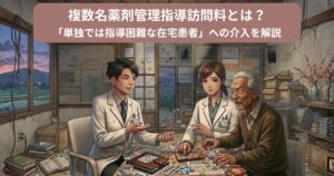 在宅で医師と薬剤師が同じ場で介入する評価は、訪問薬剤管理医師同時指導料とは?2026年改定で進む医師と薬剤師の同時訪問を解説 で、単独では難しい患者に複数名で入る評価は、複数名薬剤管理指導訪問料とは?2026年改定で評価される「単独では指導困難な在宅患者」への介入を解説 で詳しく解説しています。